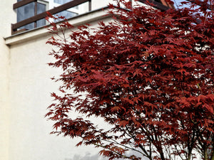 The Bloodgood Japanese Maple is renowned for its striking deep red foliage that holds its color throughout the growing season. This deciduous tree features a graceful, sweeping form, making it a stunning focal point in any garden.