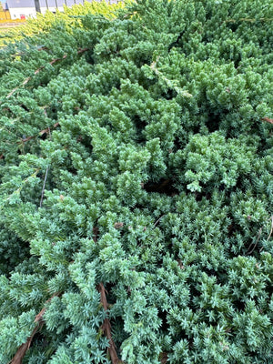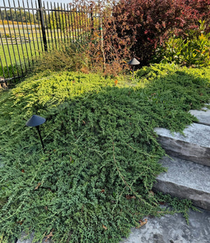 The Japanese Garden Juniper is a low-growing, evergreen shrub with a spreading habit. It features dense, green foliage and a unique, mounding shape that makes it a popular choice in garden designs.