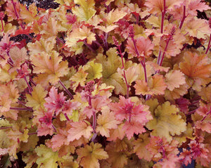 Marmalade Coral Bells features vibrant, copper-orange foliage that changes hues throughout the seasons, known for its unique coloration and tolerance to heat and humidity, it provides year-round interest in the garden.