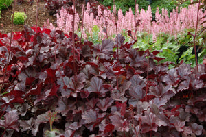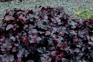 The Obsidian Coral Bells features stunning dark purple to almost black leaves that create a striking contrast in any garden. Its unique color and fine texture make it a popular choice for ornamental planting.