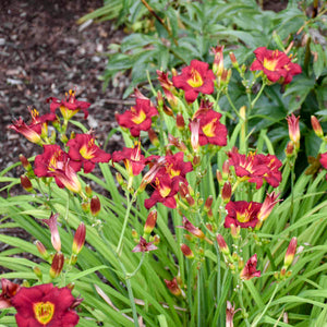 The Pardon Me Daylily is a compact perennial that features striking, rich burgundy-red flowers with a golden yellow throat. This daylily is known for its re-blooming nature, providing vibrant blooms throughout summer and attracting pollinators.