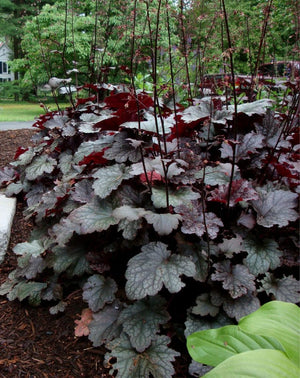 Plum Pudding Coral Bells features stunning, dark purple foliage with a silvery overlay that adds a unique dimension to any garden. Its delicate flowers, often blooming above the foliage, attract pollinators while the leaves remain a striking focal point.